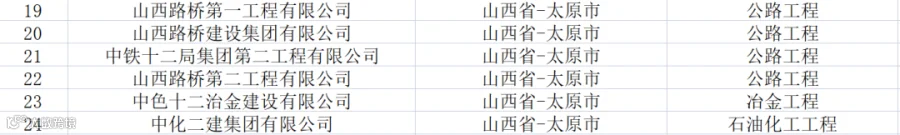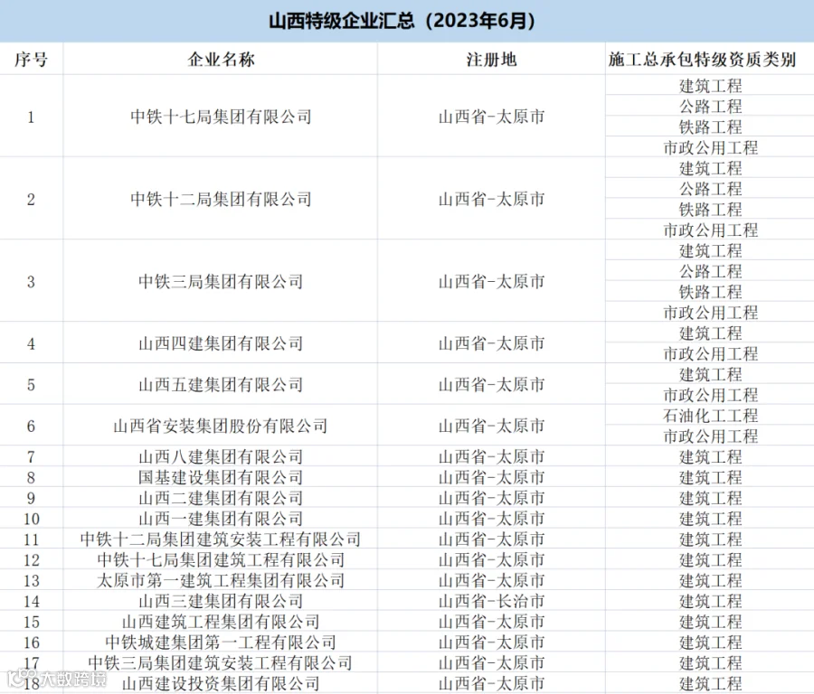 山西:共有特级企业24家,特级资质36项(建筑工程17项、公路7项、市政6项、铁路3项、石油化工2项、冶金1项)。