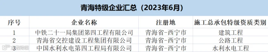青海:共有特级企业3家,特级资质3项(建筑工程1项、公路1项、水利水电1项)。
