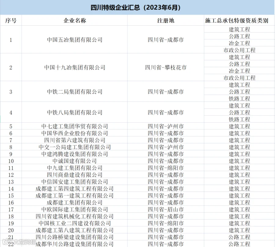 四川:共有特级企业34家,特级资质44项(建筑工程20项、公路11项、市政4项、水利水电4项、铁路3项、冶金2项)。