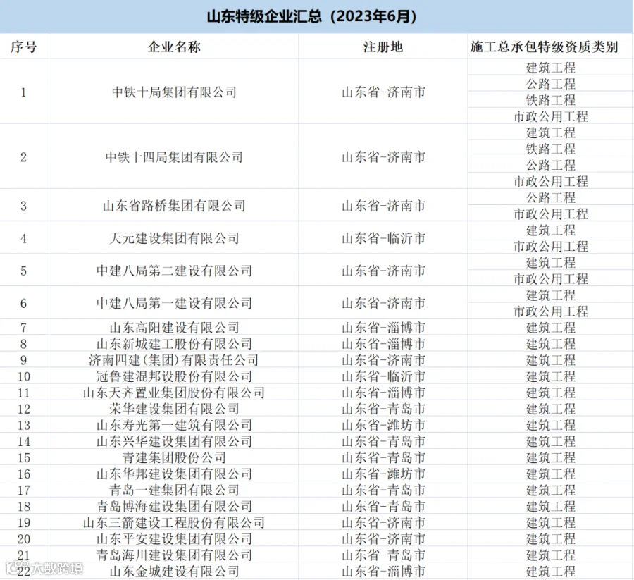 山东:共有特级企业56家,特级资质66项(建筑工程41项、公路11项、市政7项、电力3项、铁路2项、港口与航道2项)。