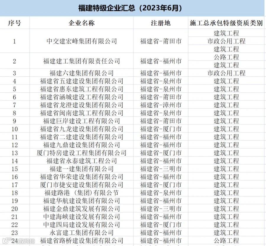福建:共有特级企业29家,特级资质32项(建筑工程25项、公路4项、市政2项、水利水电1项)。