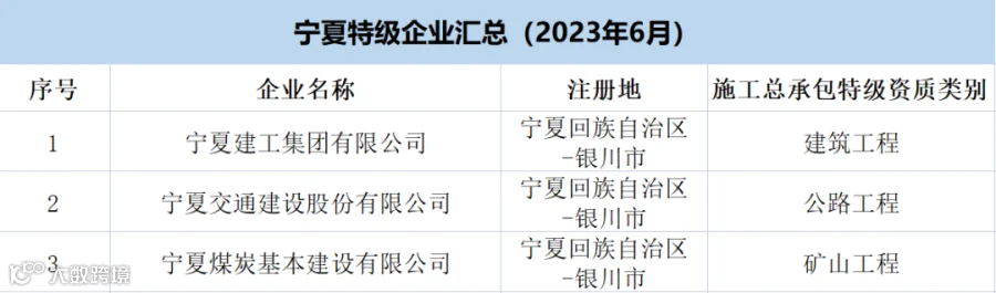 宁夏:共有特级企业3家,特级资质3项(建筑工程1项、公路1项、矿山1项)。