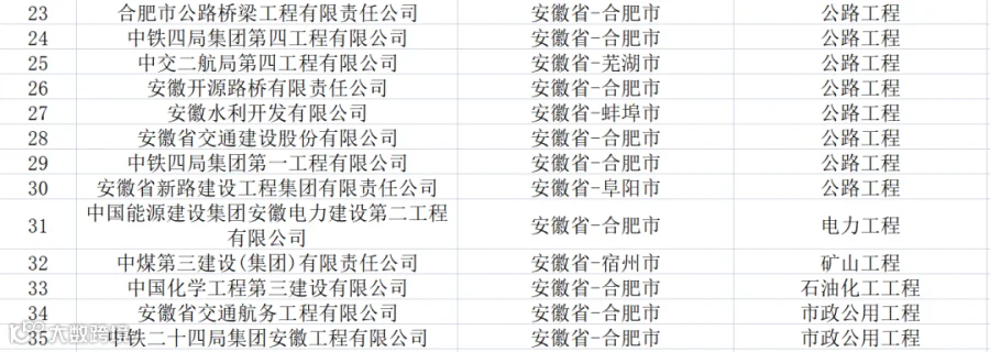 安徽:共有特级企业35家,特级资质45项(建筑工程19项、公路13项、市政6项、电力1项、港口与航道1项、矿山1项、石油化工1项、水利水电1项、铁路1项、冶金1项、)。