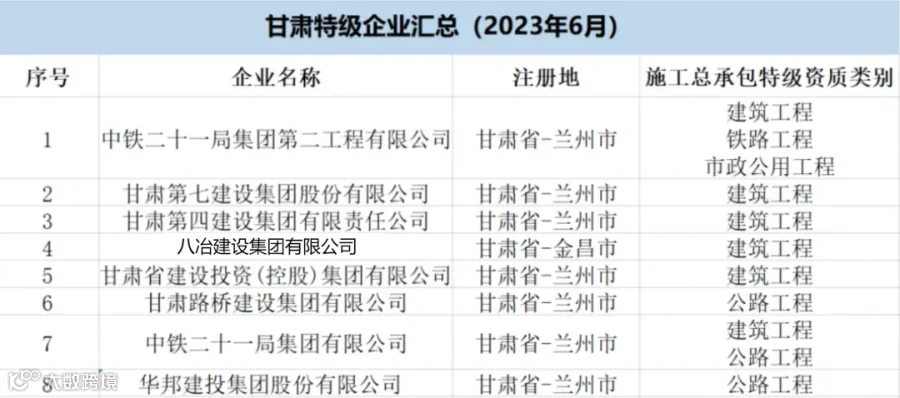 甘肃:共有特级企业8家,特级资质11项(建筑工程6项、公路3项、市政1项、铁路1项)。