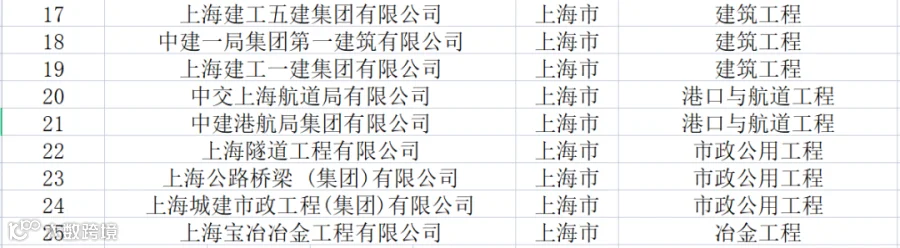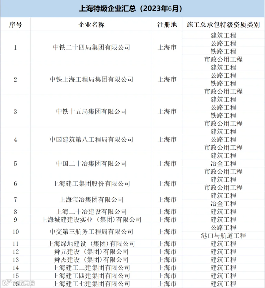上海:共有特级企业25家,特级资质41项(建筑工程18项、市政9项、公路5项、港口与航道3项、铁路3项、冶金3项)。