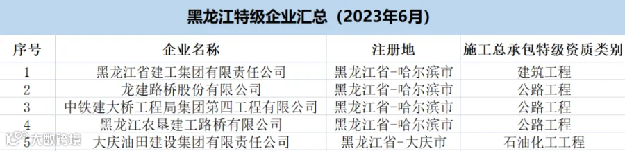 黑龙江:共有特级企业5家,特级资质5项(公路3项、建筑1项、石油化工1项)。