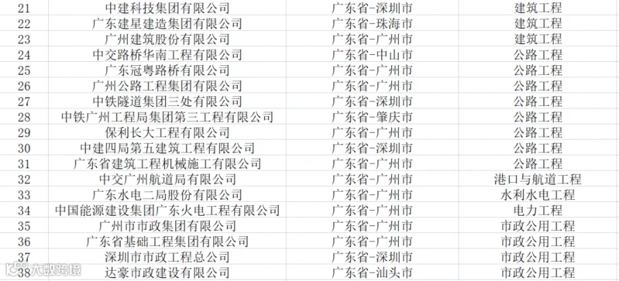 广东:共有特级企业38家,特级资质49项(建筑工程20项、公路13项、市政7项、港口与航道4项、铁路3项、电力1项、水利水电1项)。