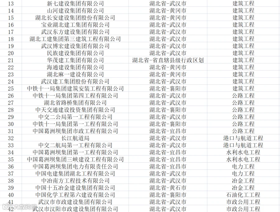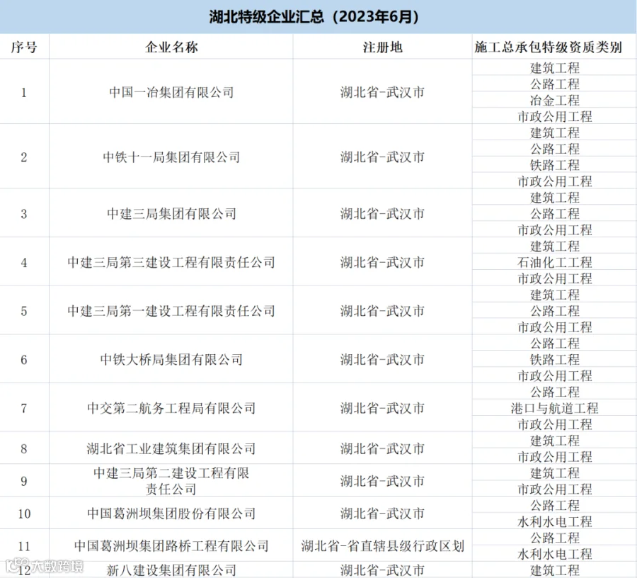 湖北:共有特级企业42家,特级资质62项(建筑工程21项、公路14项、市政11项、水利水电4项、冶金3项、港口与航道3项、电力2项、石油化工2项、铁路2项)。
