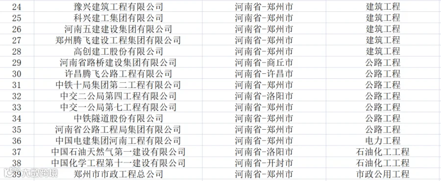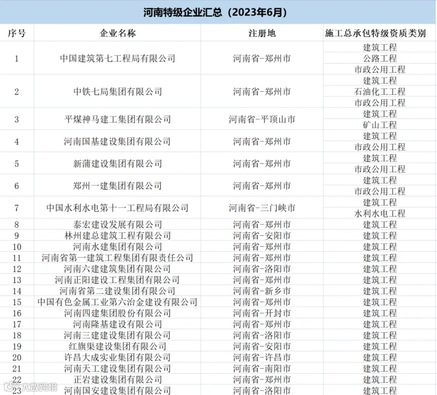 河南:共有特级企业39家,特级资质48项(建筑工程28项、公路9项、市政5项、石油化工2项、电力1项、矿山1项、水利水电1项、铁路1项)。