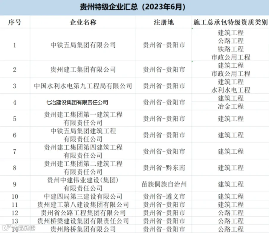 贵州:共有特级企业14家,特级资质20项(建筑工程11项、公路4项、市政2项、水利水电1项、铁路1项、冶金1项)。