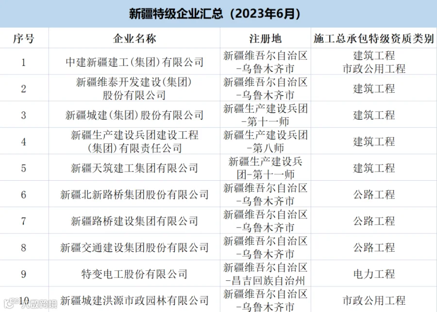 新疆:共有特级企业10家,特级资质11项(建筑工程5项、公路3项、市政2项、电力1项)。
