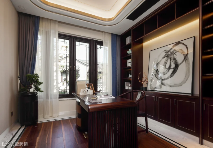“凌寒松柏有本性”。书房体现了业主独特的品味,严谨、庄重的主旋律充斥其中,抽象泼墨画也在严谨中凸显个性。同时,REX法国流金灰优雅、高级的质感,更体现了主人绅士般儒雅。