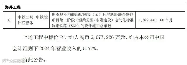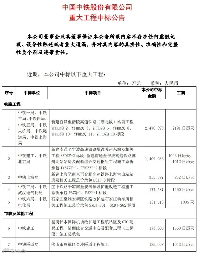 近日,中国中铁股份有限公司发布重大项目公告,公告显示,该公司近期中标8个重大项目,包括铁路工程、市政工程、海外工程等,项目金额合计667.7亿元。