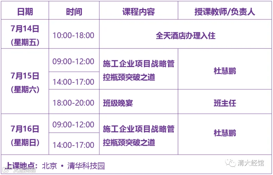 “所谓大学者,非谓有大楼之谓也,有大师之谓也。”《清大高级工商管理(建筑业)总裁研修班》课程将于北京2023年7月15日9:00准时开课。以下是2023年7月15-16日课程安排,为保证您准时参课,请提前安排行程。