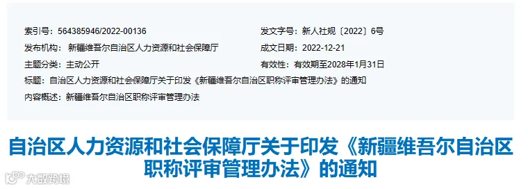 近日,新疆自治区人社厅发布《关于印发<新疆维吾尔自治区职称评审管理办法》>的通知》,本办法自2023年2月1日起执行,明确: