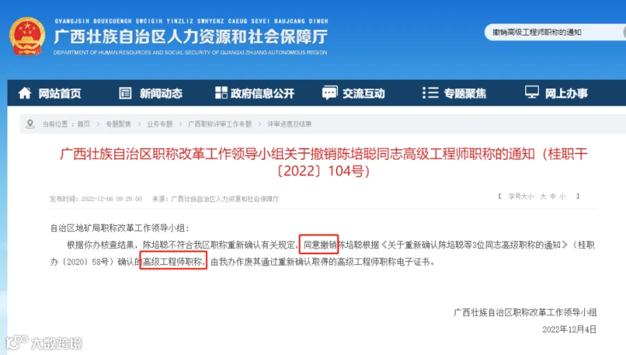 2022年12月6日,广西撤销1人高级工程师职称,作废其通过重新确认取得的高级工程师职称电子证书。