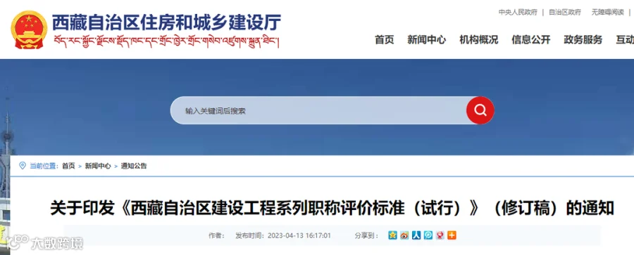 4月13日,西藏住建厅印发《西藏自治区建设工程系列职称评价标准(试行)》(修订稿),本标准自公布之日起施行。