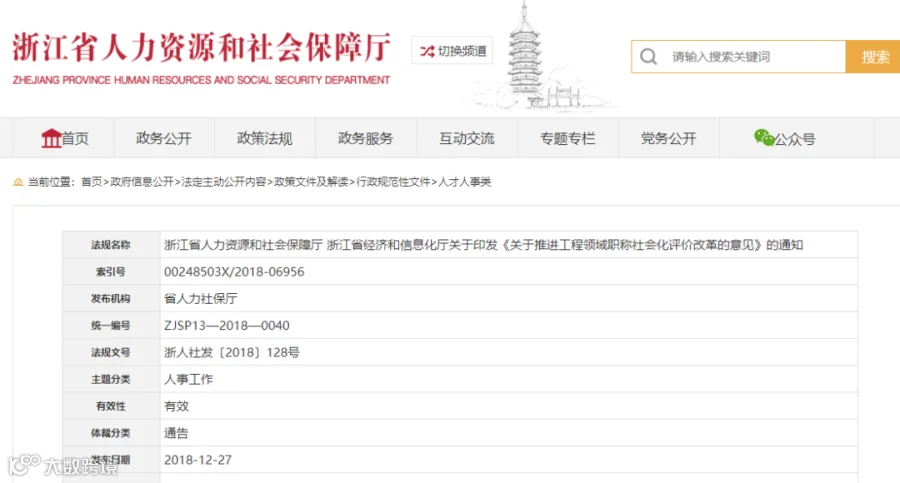 2018年12月底,浙江省人社厅、浙江省经济和信息化厅就共同印发了《关于推进工程领域职称社会化评价改革的意见》,对工程类职业技术资格与职称进行了全面对应!