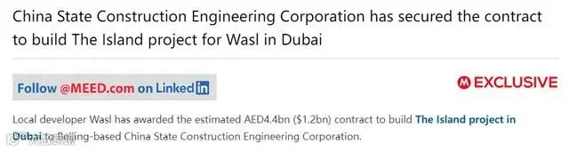 该项目名为The Island项目,于2020年就开始招标,参与投标的企业包括来自阿联酋本土的建筑商Alec、阿联酋阿拉伯建筑公司以及比利时 Bel Hasa Six Construct、中建集团等海外建筑企业。