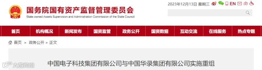 据国务院国有资产监督管理委员会官网消息,经报国务院批准,中国电子科技集团有限公司与中国华录集团有限公司实施重组,中国华录集团有限公司成为中国电子科技集团有限公司的控股子公司,不再作为国务院国资委履行出资人职责的企业。