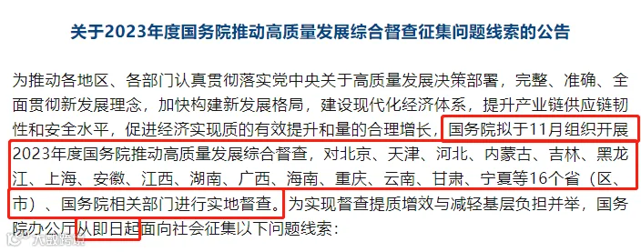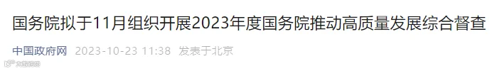 今日,中国政府网发布《公告》,拟于11月组织开展2023年度国务院推动高质量发展综合督查。
