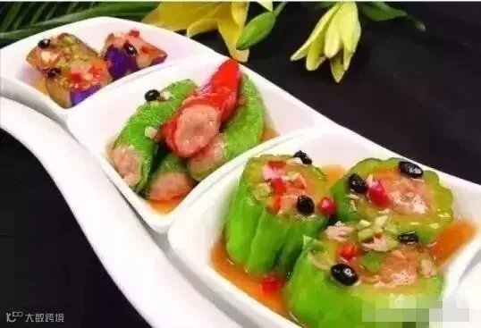 酿菜是客家菜系中常见的一种做法,许多食材都可以酿,酿三宝通常是指将酿苦瓜、酿青椒和酿茄子做成一道菜,这道菜的特点就是苦味、辣味、茄香与肉香交融在一起,风味独特,香而不腻。