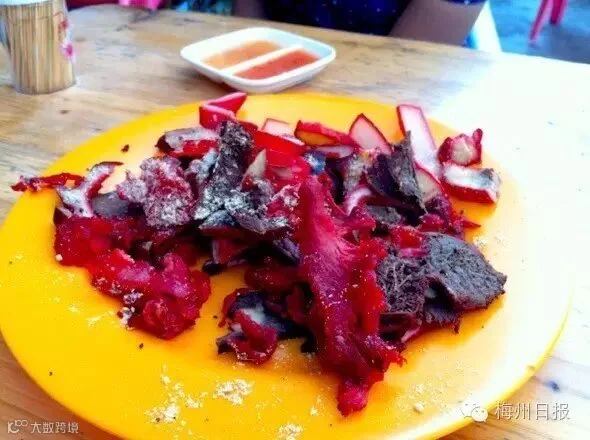 与广式牛杂不同的是,梅州的牛杂是将牛皮、牛筋、牛肚等食材加入客家人常用的红曲粉一起细火慢熬三四个小时,牛皮、牛筋有嚼劲,牛脚筋非常爽口,牛肝、牛肚肠充满酱香味,各种口感一次尝尽。话说现在的牛杂都能真空包装邮寄了,但是蘸着蒜蓉辣椒酱配上一碟腌青瓜的的味道可不是快递小哥能给你的,夏日的夜晚“绑酒”也是一流!