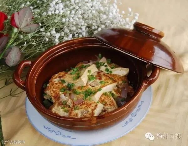 五华酿豆腐是客家地区最有名的酿豆腐。五华地区多山泉,泉水清澈,最著名便是山水豆腐。为什么一大早就要吃五华的豆腐?据一位骨灰级吃货介绍,五华人一大早刚出炉的豆腐,最是新鲜,新鲜豆腐的豆香,滑嫩的口感,是放久了的豆腐没法比的……酿豆腐原煲上桌,热气腾腾,试过就知其中好滋味!
