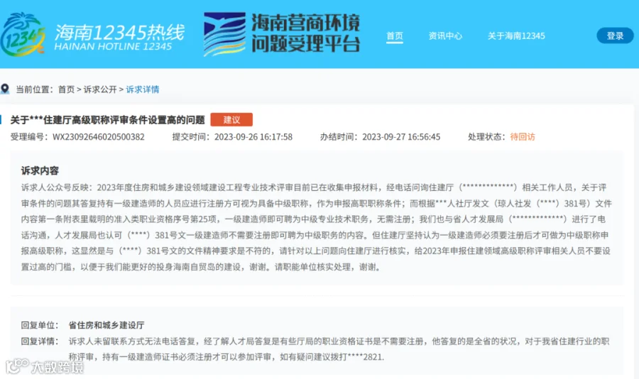 诉求内容:2023年度住房和城乡建设领域建设工程专业技术评审目前已在收集申报材料,经电话问询住建厅(*************)相关工作人员,关于评审条件的问题其答复持有一级建造师的人员应进行注册方可视为具备中级职称,作为申报高级职称条件;而根据***人社厅发文(琼人社发(****)381号)文件内容第一条附表里载明的准入类职业资格序号第25项,一级建造师即可聘为中级专业技术职务,无需注册;我们也与省人才发展局(*************)进行了电话沟通,人才发展局也认可(****)381号文一级建造师不需要注册即可聘为中级职务的内容。但住建厅坚持认为一级建造师必须要注册后才可做为中级职称申报高级职称,这显然是与(****)381号文的文件精神要求是不符的,请针对以上问题向住建厅进行核实,给2023年申报住建领域高级职称评审相关人员不要设置过高的门槛,以便于我们能更好的投身海南自贸岛的建设,谢谢。请职能单位核实处理,谢谢。