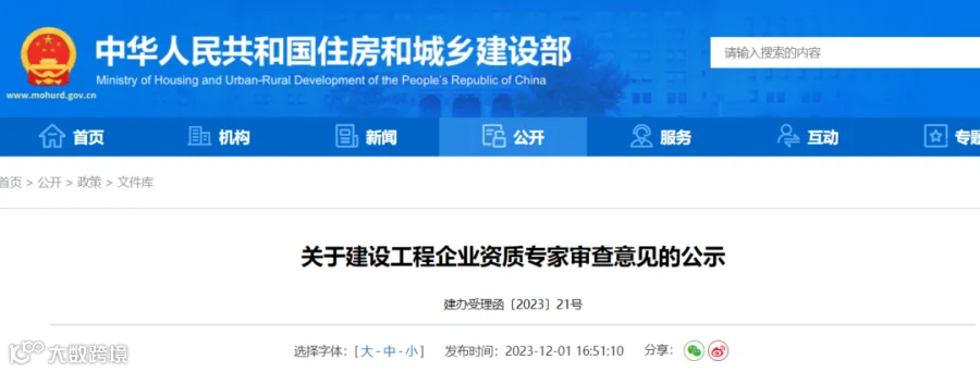 按照《行政许可法》及有关建设工程企业资质管理规定,我部对近期申请建设工程企业资质的申报材料组织了专家审查,现将专家审查意见在住房城乡建设部门户网站(https://www.mohurd.gov.cn)予以公示,以广泛接受社会监督。企业申报材料中的人员、代表工程业绩等详细情况,可通过点击“住房城乡建设部门户网站→建设工程企业资质行政审批专栏→资质申报基本信息公示”进行查询。