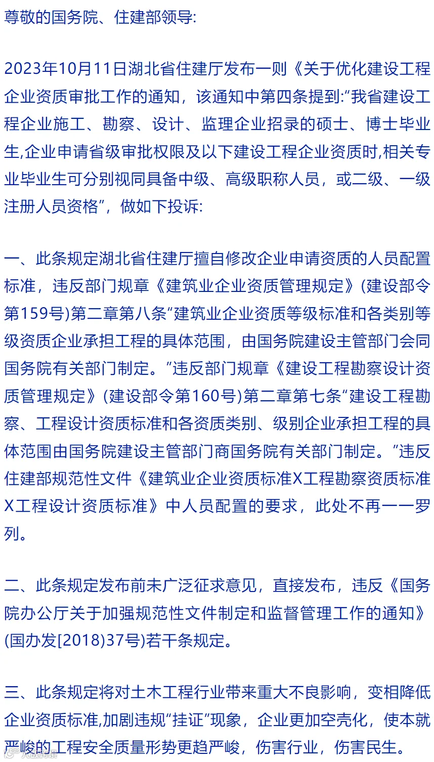 10月11日,湖北省住建厅发布《关于优化建设工程企业资质审批工作的通知》,规定硕士、博士相关专业毕业生可分别视同具备中级、高级职称人员,或二级、一级注册人员资格。(详情可见:王炸!住建厅:10月10日起,硕、博等同注册人员!博士对应一级,硕士对应二级!用作申请省级及以下资质)