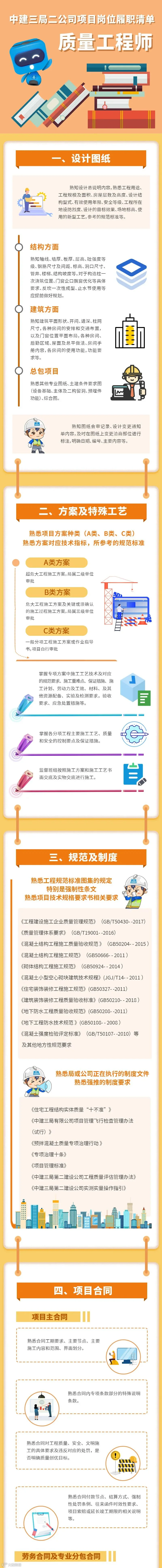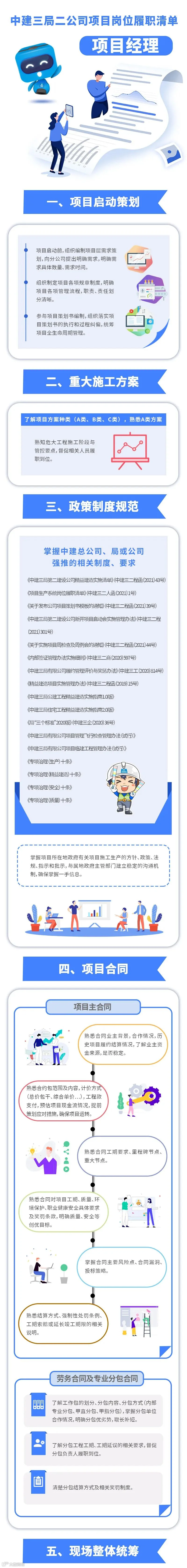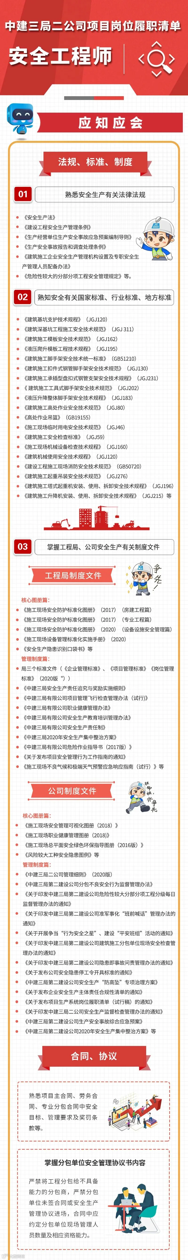 项目部各岗位工作该怎么干?中建三局二公司为规范项目生产系统岗位管理责任、增强项目员工履职尽责意识、提升项目管理水平,对①项目经理②建造总监③安全总监④质量工程师⑤专业工程师⑥安全工程师六项管理岗位的工作内容与管理职责细化明确,推出《中建三局二公司项目生产系统岗位履职清单》,推荐大家对照学习。