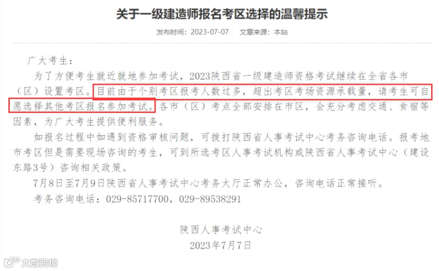 这种因考场不足也还是一建首次出现,在今年7月陕西一建报考,官方发文提示公告中也能看到今年一建人数大增:报考目前由于个别考区报考人数过多,超出考区考场资源承载量,请考生可自愿选择其他考区报名参加考试。