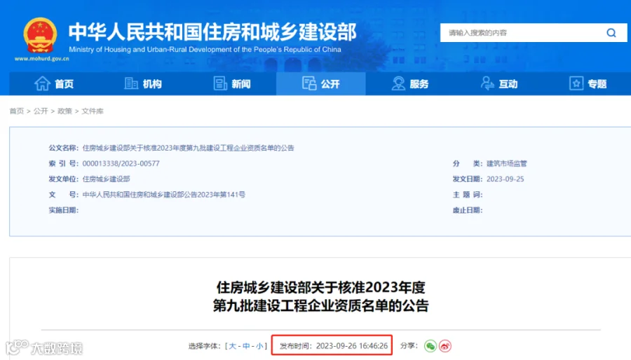 刚刚,住建部发布《关于核准2023年度第九批建设工程企业资质名单的公告》,1家企业成功晋升特级!