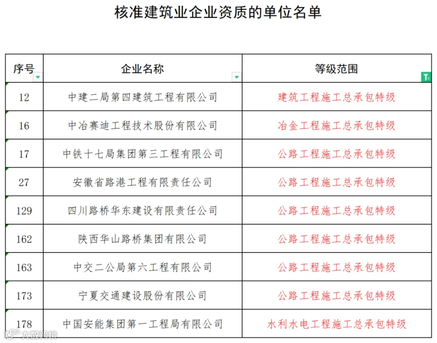 4月28日,住建部发布《关于核准2023年度第四批建设工程企业资质名单的公告》,5家企业成功“升特”。