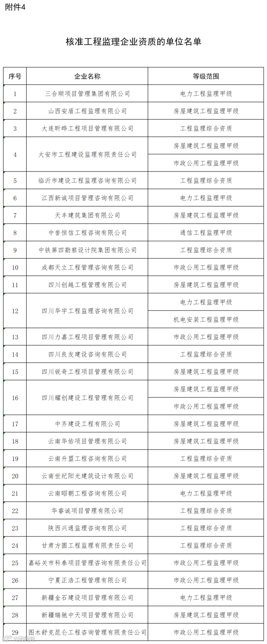 4.核准工程监理企业资质的单位名单