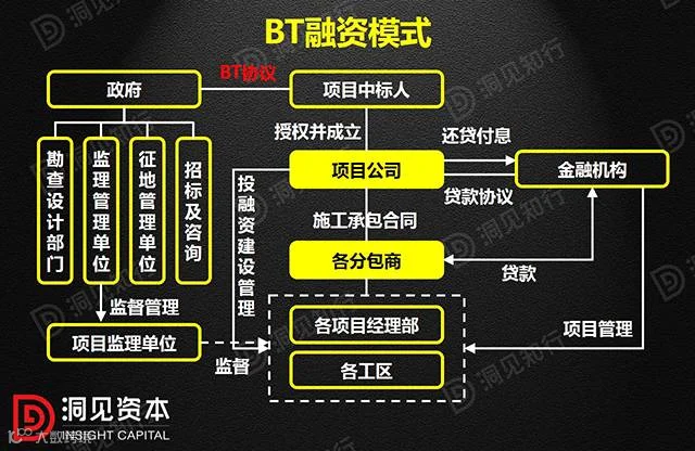 在市场经济条件下,BT模式是从BOT模式转化发展起来的新型投资模式。采用“BT”模式建设的项目,所有权是政府或政府下属的公司;政府将项目的融资和建设特许权转让投资方;投资方是依法注册的国有建筑企业或私人企业;银行或其他金融机构根据项目的未来收益情况为项目提供融资贷款。政府(或项目筹备办)根据当地社会和经济发展的需要,对项目进行立项,进行项目建议书、可行性研究、筹划报批等前期准备工作,委托下属公司或咨询中介公司对项目进行BT招标;与中标人(投资方)签订BT投资合同(或投资协议);中标人(投资方)组建BT项目公司,项目公司在项目建设期行使业主职能,负责项目的投融资、建设管理,并承担建设期间的风险。项目建成竣工后,按照BT合同(或协议),投资方将完工的项目移交给政府(政府下属的公司)。政府(或政府下属的公司)按约定总价(或完工后评估总价)分期偿还投资方的融资和建设费用。政府及管理部门在BT投资全过程中行使监管、指导职能,保证BT投资项目的顺利融资、建成、移交。