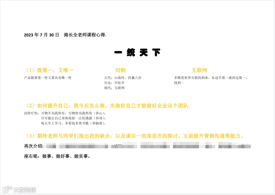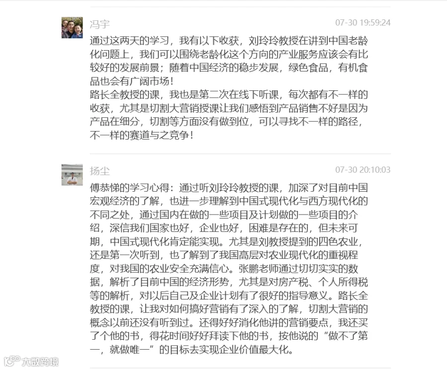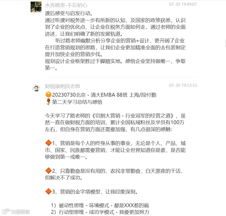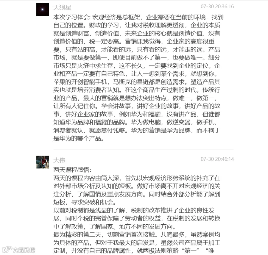 韩同学:学习到了在使用场景下的深度挖掘,培养消费者的新习惯,提供新供给关系这样的新思路,在全世界最大的市场中国,任何产业都可以重新做一次,并且结合路长全老师的课程,任何成熟产业在切割后,打造细分行业的第一或唯一,都可以升级再造成为一个非常非常大的产业。两天的课程学习完,为以后我们自身产业的再造和升级有一些帮助,也给了我更多的可能性以及如何建立壁垒和提高产业附加值的思路。