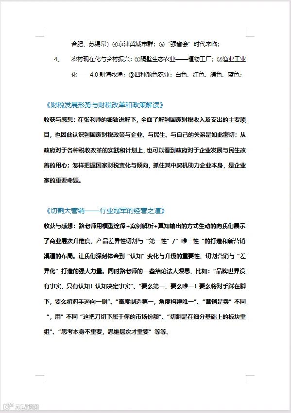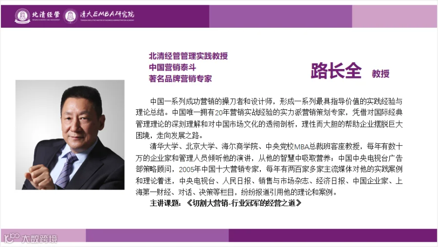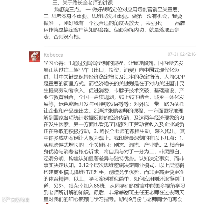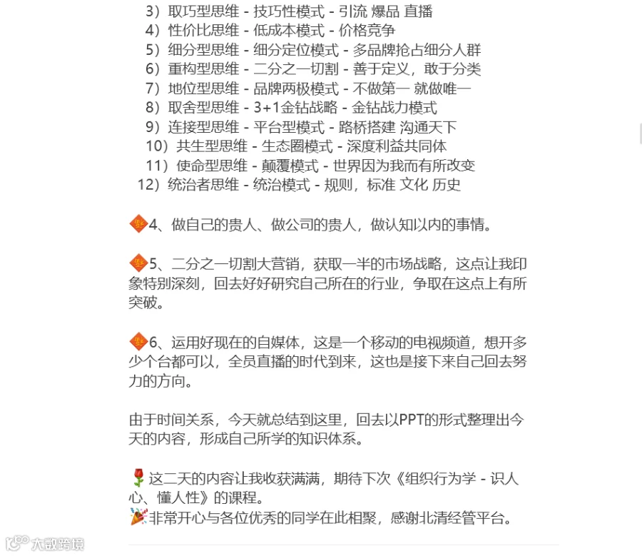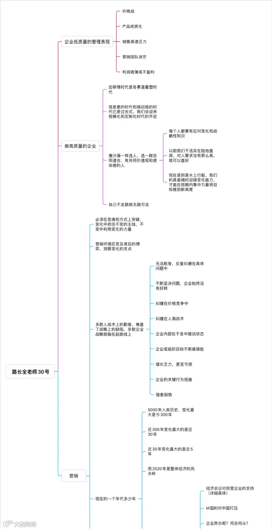 卢同学:路长全老师的课题,更多是实战,鼓励,结合当下形式与政策,如何让企业破茧重生,打破传统思维,提高销量与知名度,树立企业文化形象,传播展示企业成果流入市场,提出更为有效的切割式营销法则,结合企业发展现状,线上线下互联,经营范围等,大量列举成功案例,盼望学子们在公司的实战中得以使用借鉴,最后用一句话结束:没有干不成的事,只有干不成事的人。