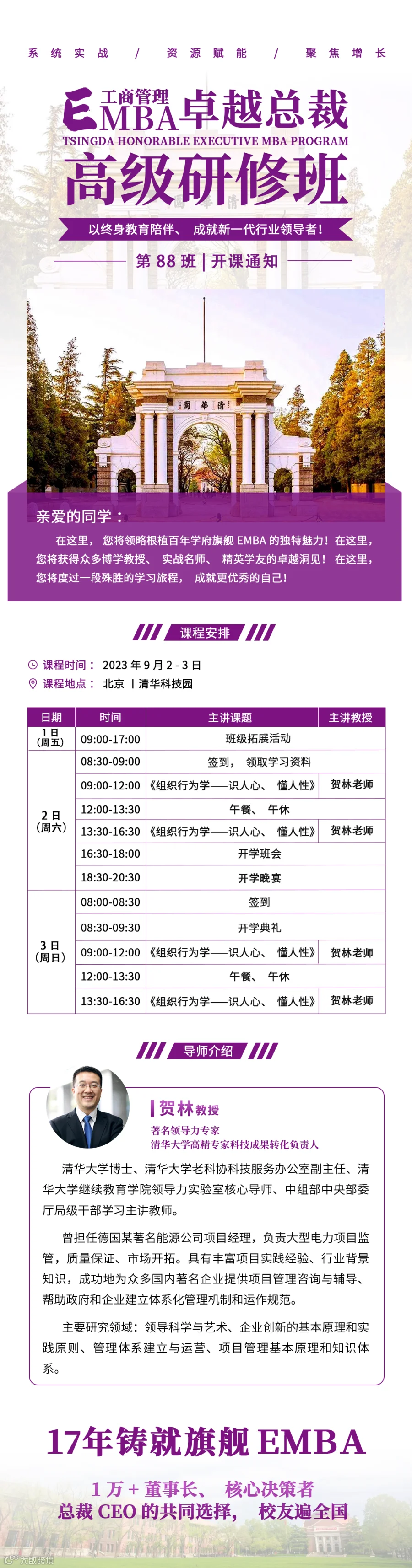 汇聚好老师,传授真知识!EMBA88班将在下次课程迎来开学典礼,同时将由贺林老师为大家讲授《组织行为学——识人心、懂人性》。希望各位企业家同学都能在课程中得到更多知识和收获,同时EMBA89班正在火热招生中,欢迎更多企业家同学加入我们的课堂!