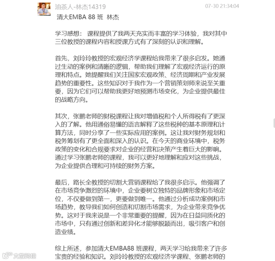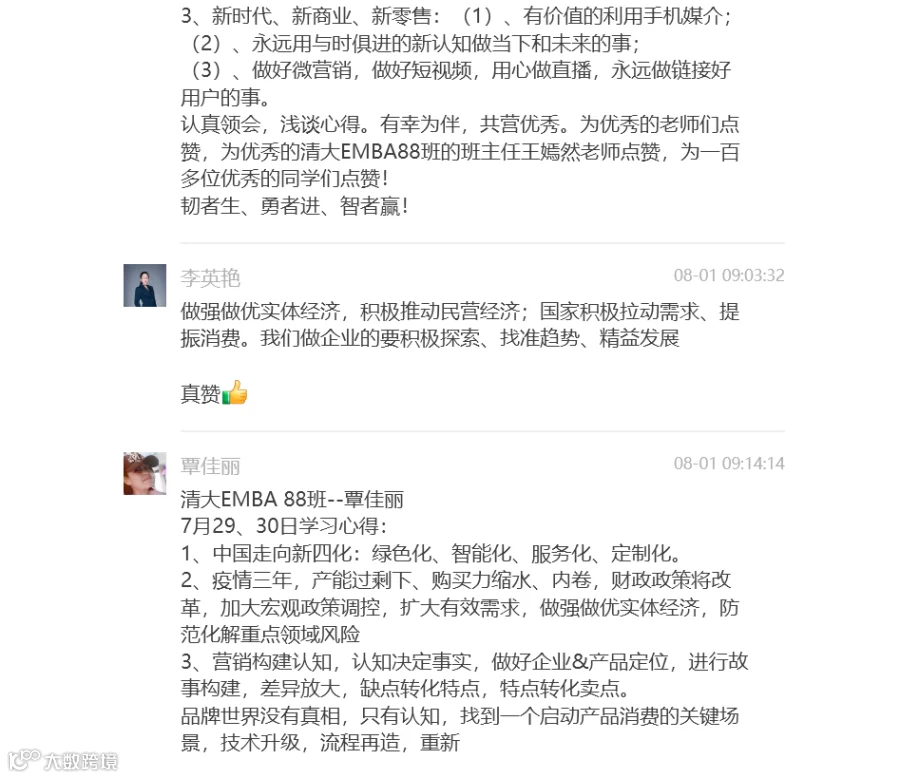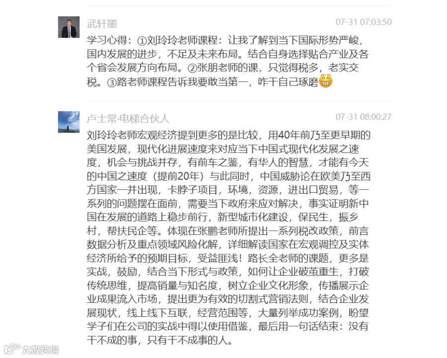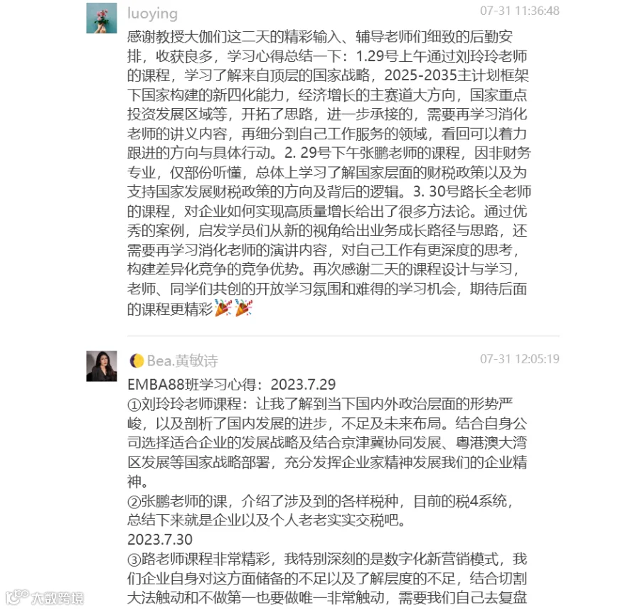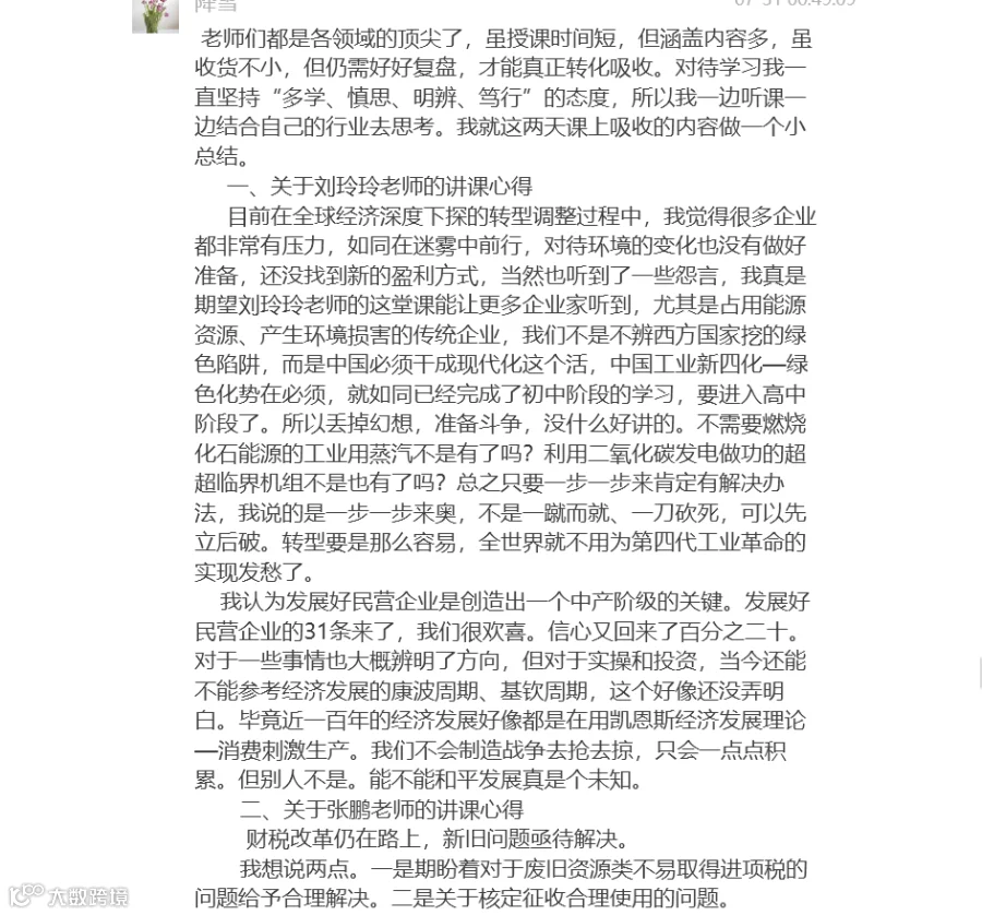 耿同学:顺势而为,应势而动。很荣幸有机会聆听刘玲玲教授、张鹏专家对宏观经济和财税政策的系统性解读。透过政策、环境、趋势去思考企业的长远规划,调整业务的中期布局,把握经营的短期机会,是从从课堂上持续延伸到课外持续必做的功课,顺势而为,是企业家从宏观到微观的着力点。我也始终认为,企业家是需要有社会责任的,老师们梳理了国内外部环境,也强调了企业家的力量,作为微观的个体、企业,更要应势而动,响应宏观的时代召唤,为树立行业标杆、带动区域发展、优化营商环境、解决社会问题做些力所能及的事情。