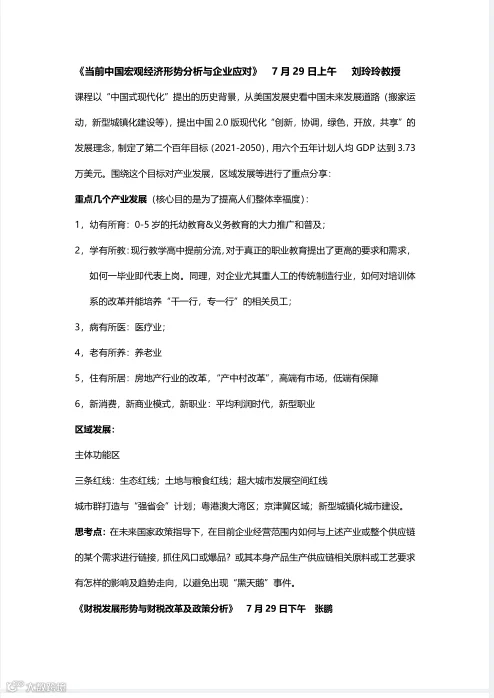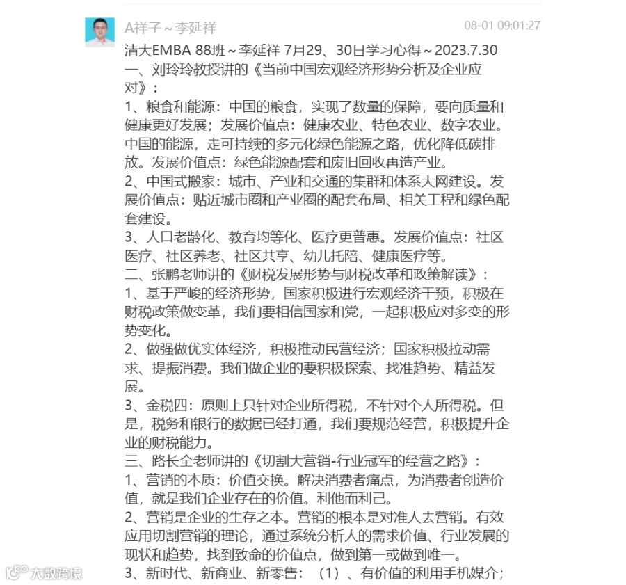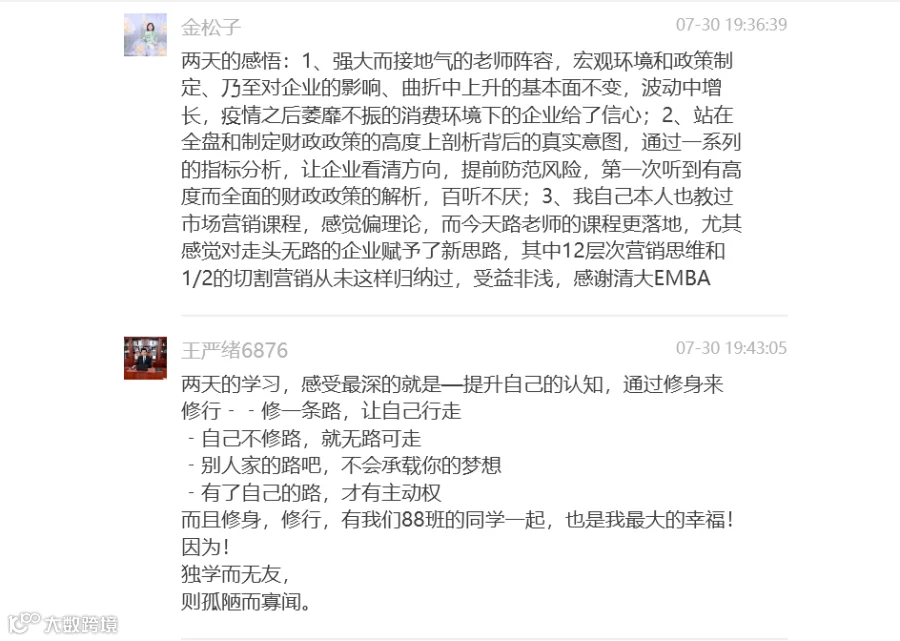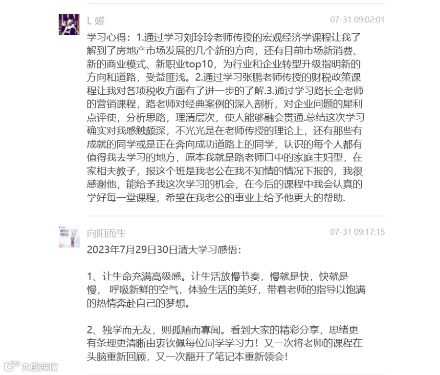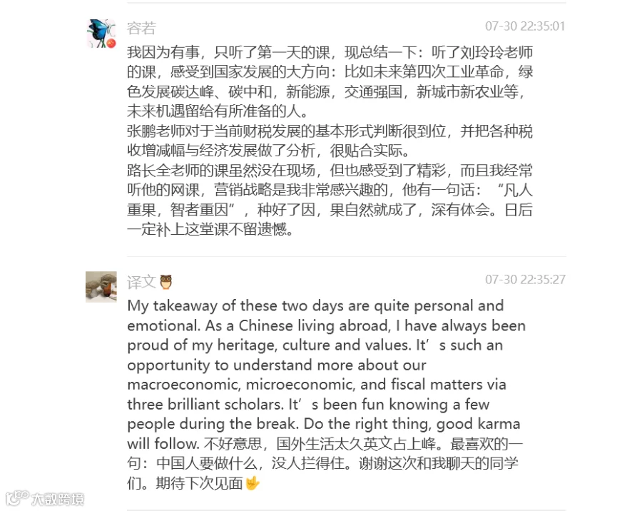 耿同学:顺势而为,应势而动。很荣幸有机会聆听刘玲玲教授、张鹏专家对宏观经济和财税政策的系统性解读。透过政策、环境、趋势去思考企业的长远规划,调整业务的中期布局,把握经营的短期机会,是从从课堂上持续延伸到课外持续必做的功课,顺势而为,是企业家从宏观到微观的着力点。我也始终认为,企业家是需要有社会责任的,老师们梳理了国内外部环境,也强调了企业家的力量,作为微观的个体、企业,更要应势而动,响应宏观的时代召唤,为树立行业标杆、带动区域发展、优化营商环境、解决社会问题做些力所能及的事情。