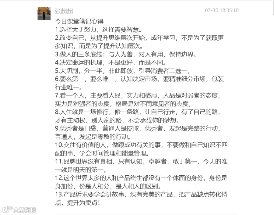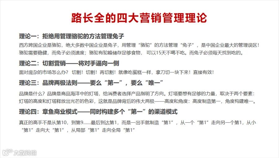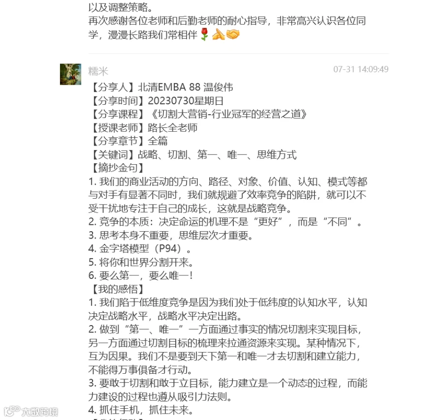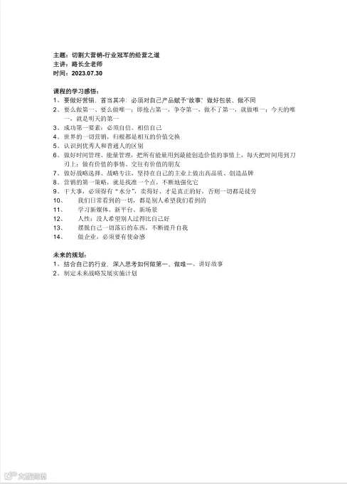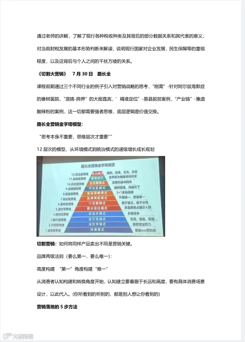 邢同学:关于路长全老师的讲课,我想说三点。一、做好战略定位对应用切割营销至关重要;二、思考本身不重要、思维层次才重要。做第一没有机会,我要做唯一。刚好我有一个很合适的角度去放大、去强化;三、品牌运作就是搞定客户认知的套路。但必须练内功,就是落地五步法,否则没有根。