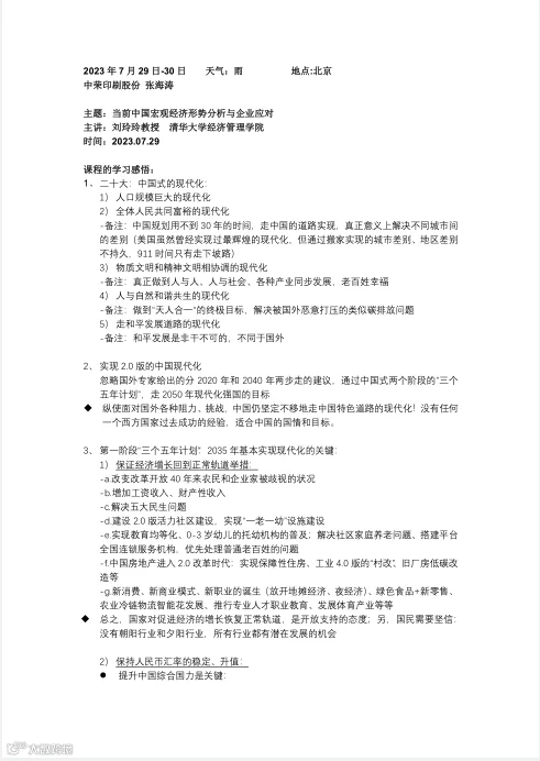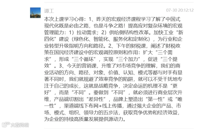 谭同学:昨天的宏观经济课程学习了解了中国式现代化既是必由之路,也是斗争之路!提高应对复杂环境的宏观管理能力:1)拉动需求;2)供给侧结构性改革。加快工业“新四化”建设(绿色化、智能化、服务化和定制化),为行业和企业转型升级指明方向和路径。