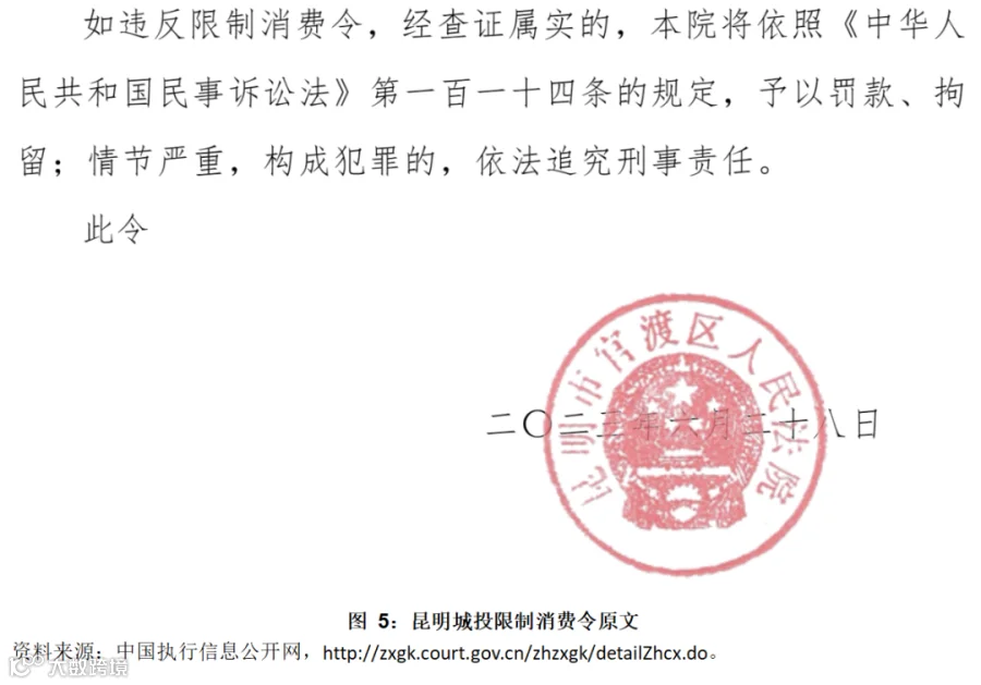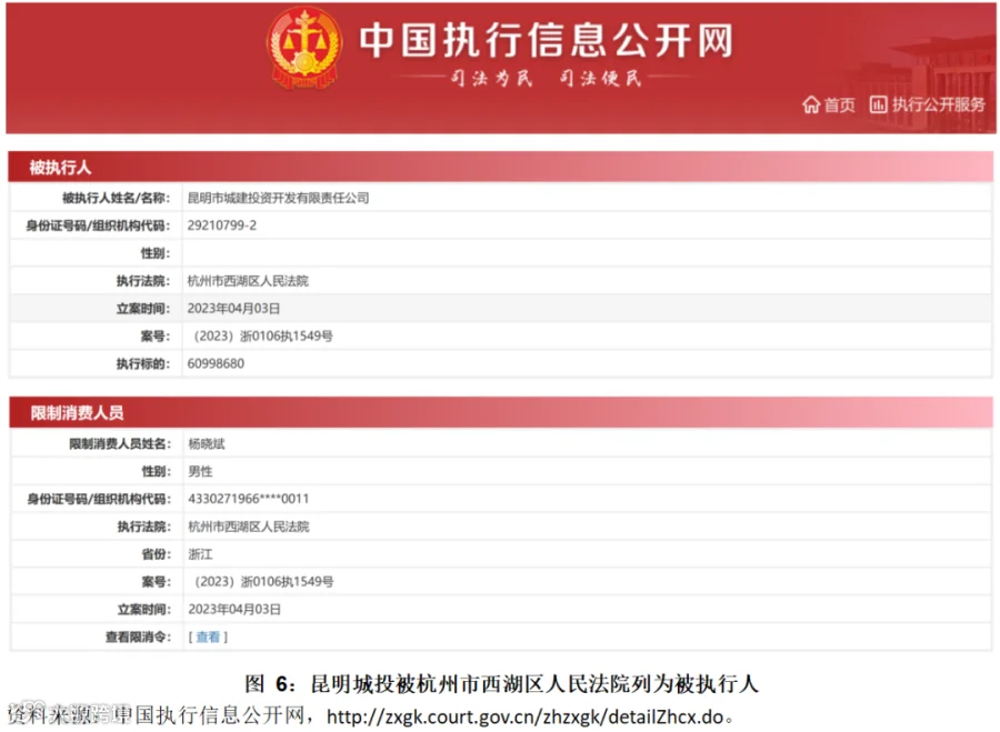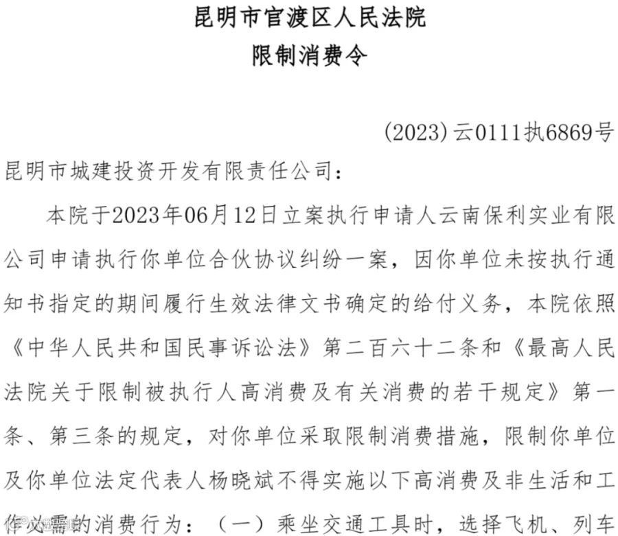 根据中国执行信息公开网显示,昆明城投在2023年04月03日被杭州市西湖区人民法院列为被执行人,也同样下发了限制消费令。