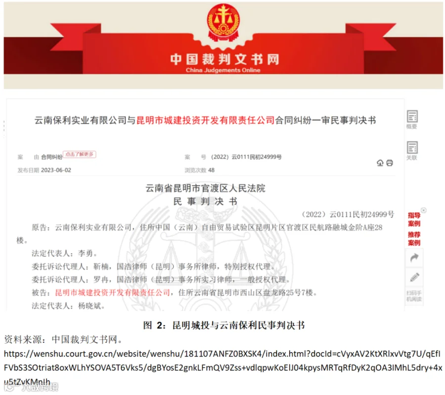 2023年6月13日因昆明城投未按照生效裁判文书履行义务,云南保利向法院申请强制执行,执行标的为225,005,866元。