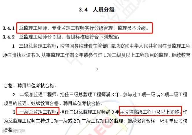 其中,《监理人员职业标准》中提出:总监理工程师、专业监理工程师实行分级管理,监理员不分级。