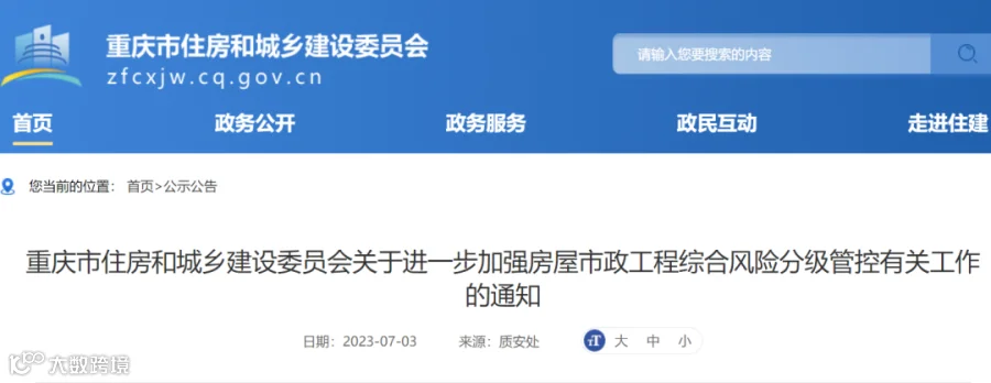 刚刚,重庆市住建委发布《关于进一步加强房屋市政工程综合风险分级管控有关工作的通知》(全文见文章末尾),本通知自2023年7月1日起实施。