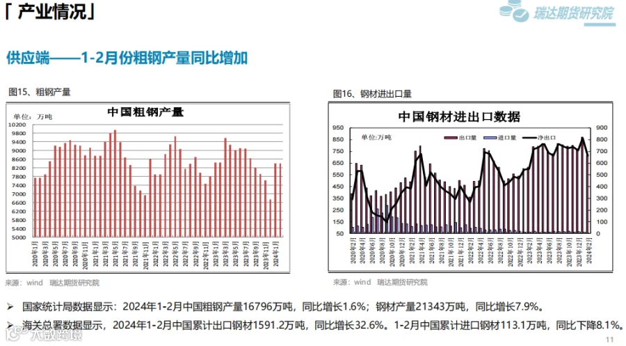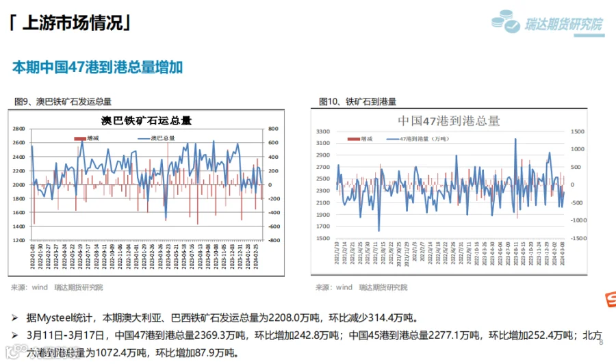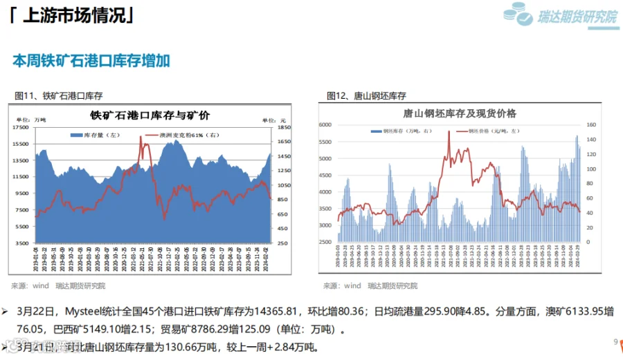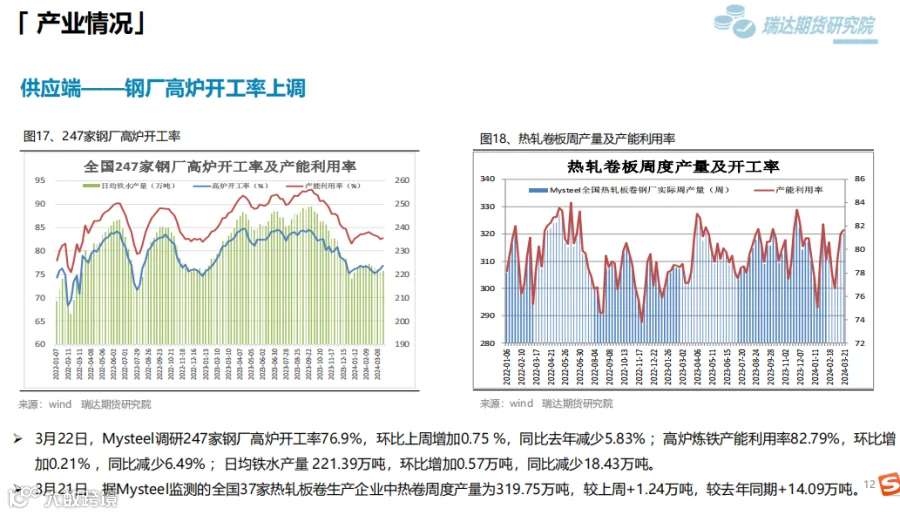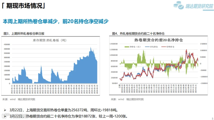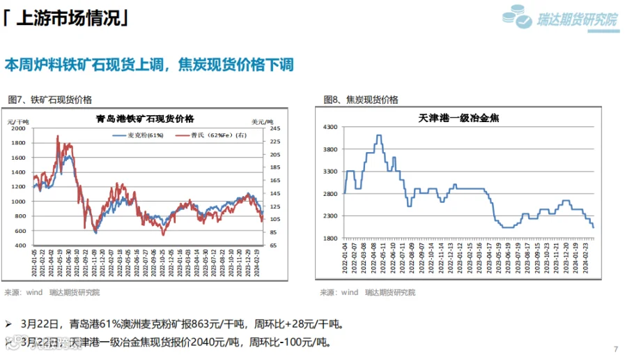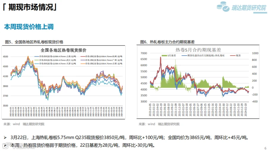 本周(3.15-3.22)热卷价格止跌反弹。由于钢价持续走弱,多数钢厂陷入亏损,近日,广东、山东、山西、新疆等多地钢协倡议控产,市场悲观情绪逐步缓解,同时国内以旧换新和大规模的设备更新政策信号带来提振,支撑价格向上走高。 下周(3.22-3.29)供应端、热卷周度产量延续小幅上调,产能利用率维持在80%上方,由于建筑钢材偏弱,钢厂将更多铁水向板材转移。需求端,下游复产增多,采购量增加,库存量由增转降。最后,国内宏观面政策向好,现货市场情绪回暖,流通商批量订货,低价资源消失。
