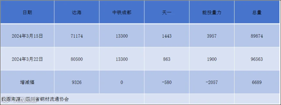 本周四川省钢材流通协会对样本钢厂关于板材出货量统计数据显示,达海出货量80500吨,较上周增加9326吨;中铁成都出货13300吨,与上周一致;天一出货863吨,较上周减少580吨;能投量力出货1900吨,较上周减少2057吨;总出货量96563吨,较上周增加6689吨。
